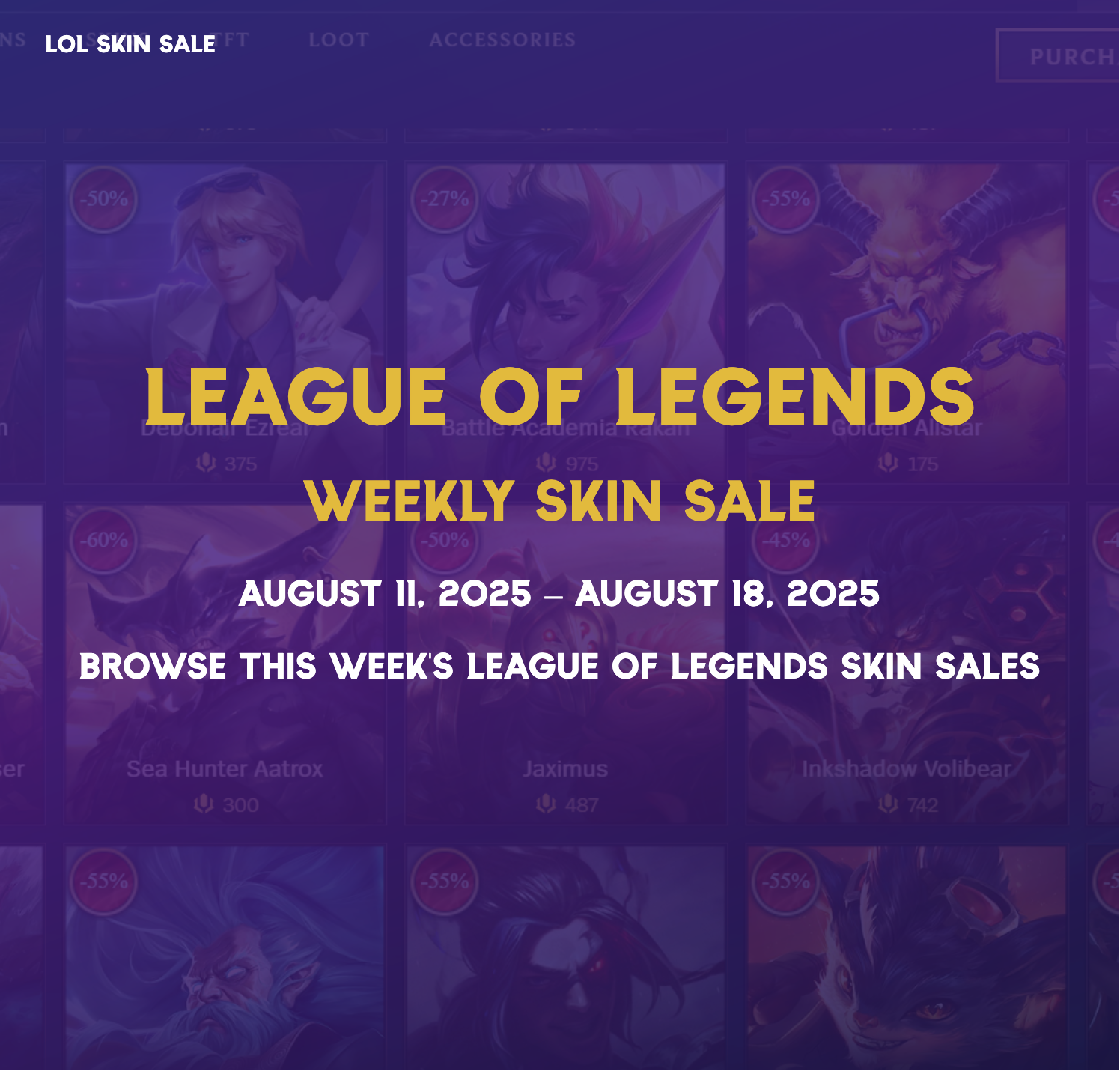 League of Legends Weekly Skin Sale website – View the current week's featured skin sales and review past sale history. Pulls live data from a personal Google Sheets API and Riot Games Data Dragon to keep information accurate and up-to-date.